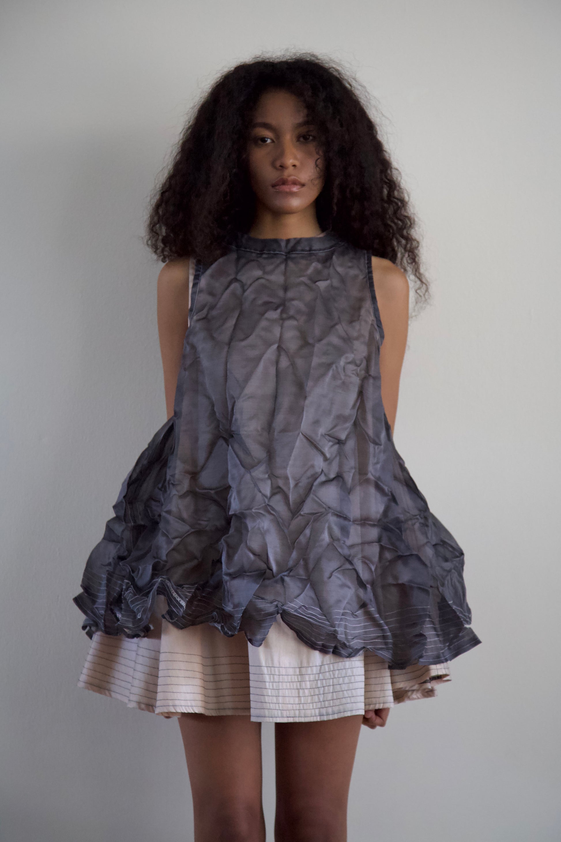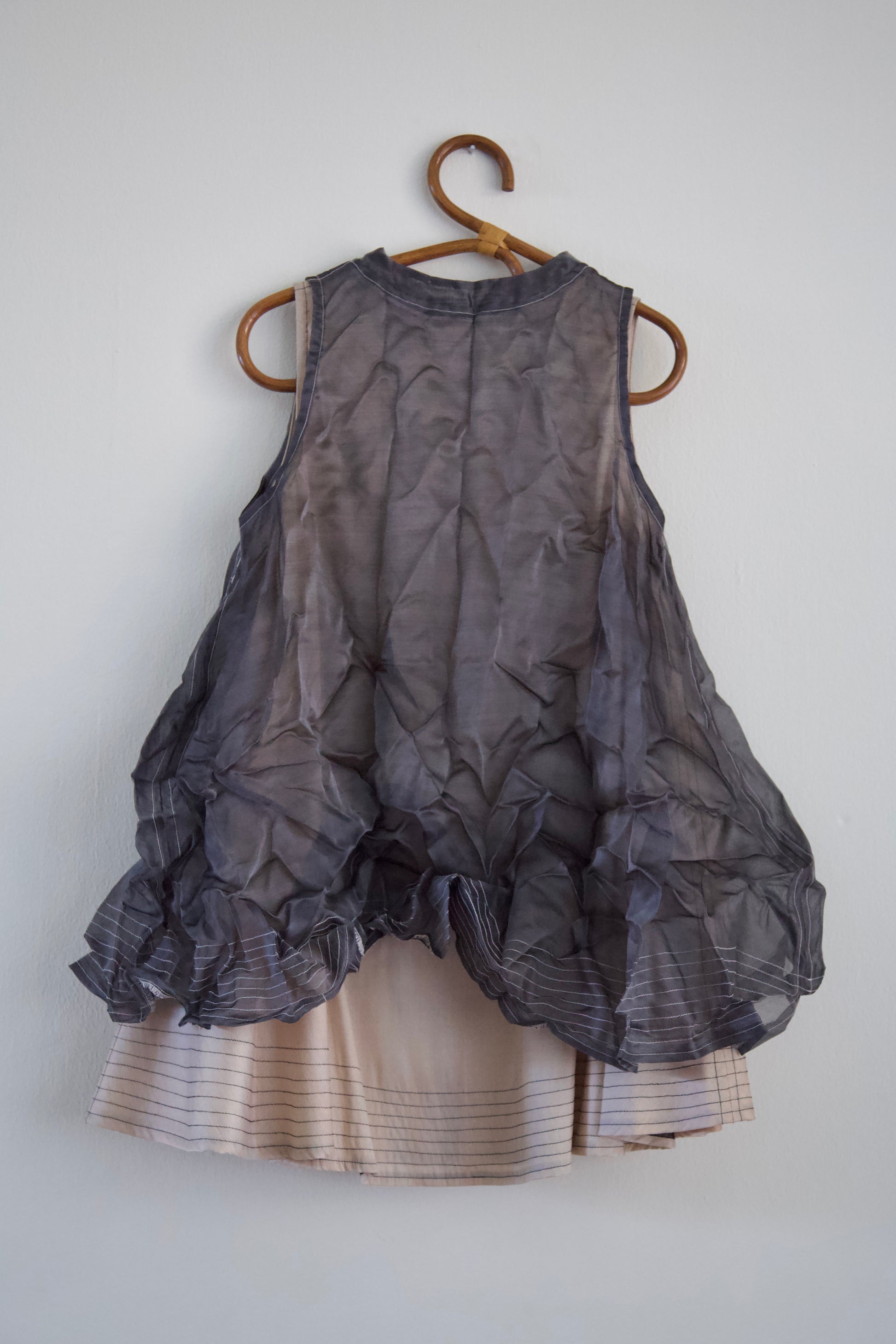 Gently hand-wash with cold water and mild soap (such as gentle shampoo). Do not soak. Roll in towel to soak up excess water. Hang to dry until 80% dried, then gently twist and crumple-up into storage bag to complete drying process. Once completely dried (ideally overnight), remove from bag and shake well to help 'pleats' bloom and relax, at which time the piece can be worn as-is or it can be partially steamed to volume desired. If you desire less crumpled texture, hang outside of the storage bag and pleats will settle somewhat over time.